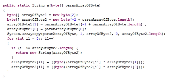 2. 확인 내역 해당 악성 앱은 Anti VM 기술이 적용되어 있어 가상 환경에서는 악의적인 행위를 하지 않는다. 정상적인 소스파일과 악의적인 소스파일이 모두 존재하며, 악의적인 소스파일의 경우 문자열 난독화가 적용되어 있어 악의적인지 판단하기 어렵게 하였다. [그림2. 문자열 난독화 내역]