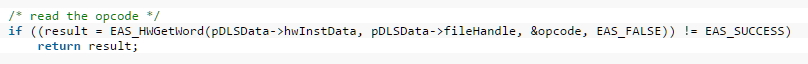 Parse_cdl함수에서 while 반복 구문의 "size" 값은 xmf 파일에서 파싱된 값이기 때문에 공격자가 조절이 가능한 값이다. 그리고 변수인 opcode의 값도 EAS_HWGetWord()에 의해서 세팅이되는데 이 값 또한 공격자가 조절이 가능하다.