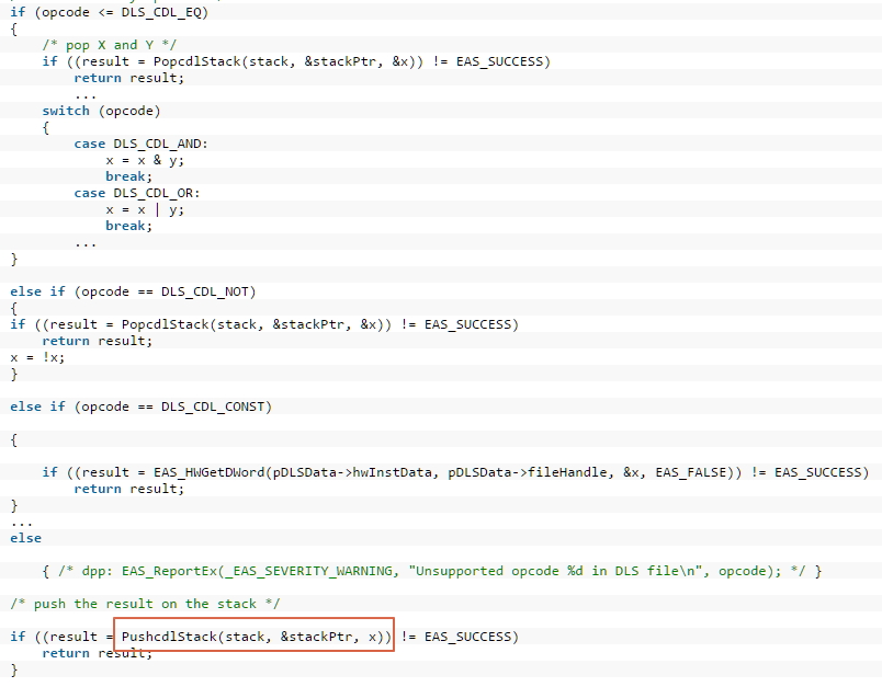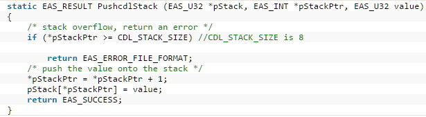 코드의 내용은 처음에 *pStackPtr의 값을 체크한다. 그 후엔 *pStackPtr에 1을 더하고, pStackPtr안에 값을 저장한다. if 구문에서 체크하는 값이 일치하지 않는다면 PushcdlStack()함수는 8번 반복이 된다.따라서 *pStackPtr의 값은 -1~7이 된다. Parse_cdl()의 함수에서 while문이 9번째 반복될 때, opcode는 DLS_CDL_CONST(0x0010)으로 세팅된다. 이 때 x의 값은 공격자가 조절 가능한 xmf 파일로 부터 가져오고 스택에 저장한다. 이제 PushcdlStack()을 호출할 때 *pStackPtr은 7에서 1일 더해지고, 스택오버 플로우가 발생한다.