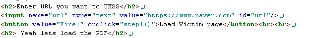문서 파싱 에러가 발생 된 후, 파일은 정상적으로 로드가 되고 UXSS 버튼 클릭시 새탭에 열어 둔 네이버 페이지에서 스크립트가 실행되는 것을 확인 할 수 있다.